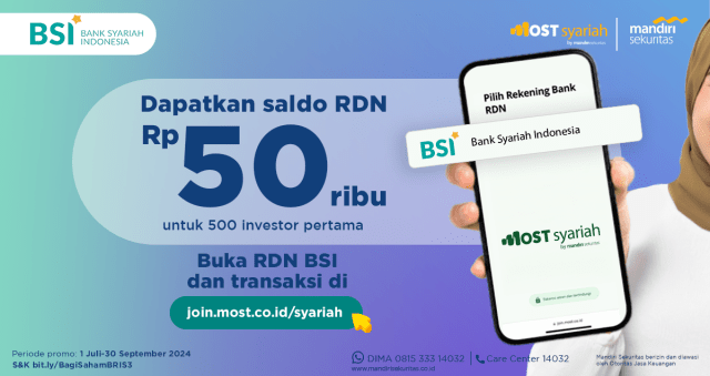 - Untuk 500 nasabah pertama yang berhasil menyelesaikan pembukaan rekening efek MOST syariah BSI dan melakukan transaksi produk ekuitas sejumlah min. Rp5.000.000,- (lima juta) selama periode program yang tercepat, berkesempatan untuk mendapatkan hadiah berupa Saldo RDN senilai Rp50.000,- (lima puluh ribu).