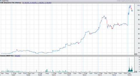 Dari grafik ini, kita dapat melihat pertumbuhan saham-saham blue chip yang sangat signifikan, salah satunya HMSP. Kita bisa mendapatkan keuntungan yang besar bila berinvestasi saham seperti ini. Di awal pencatatannya, saham HMSP dihargai sekitar Rp8.000/lembar. Sekarang, harga sahamnya telah mencapai Rp100.000,00/lembar